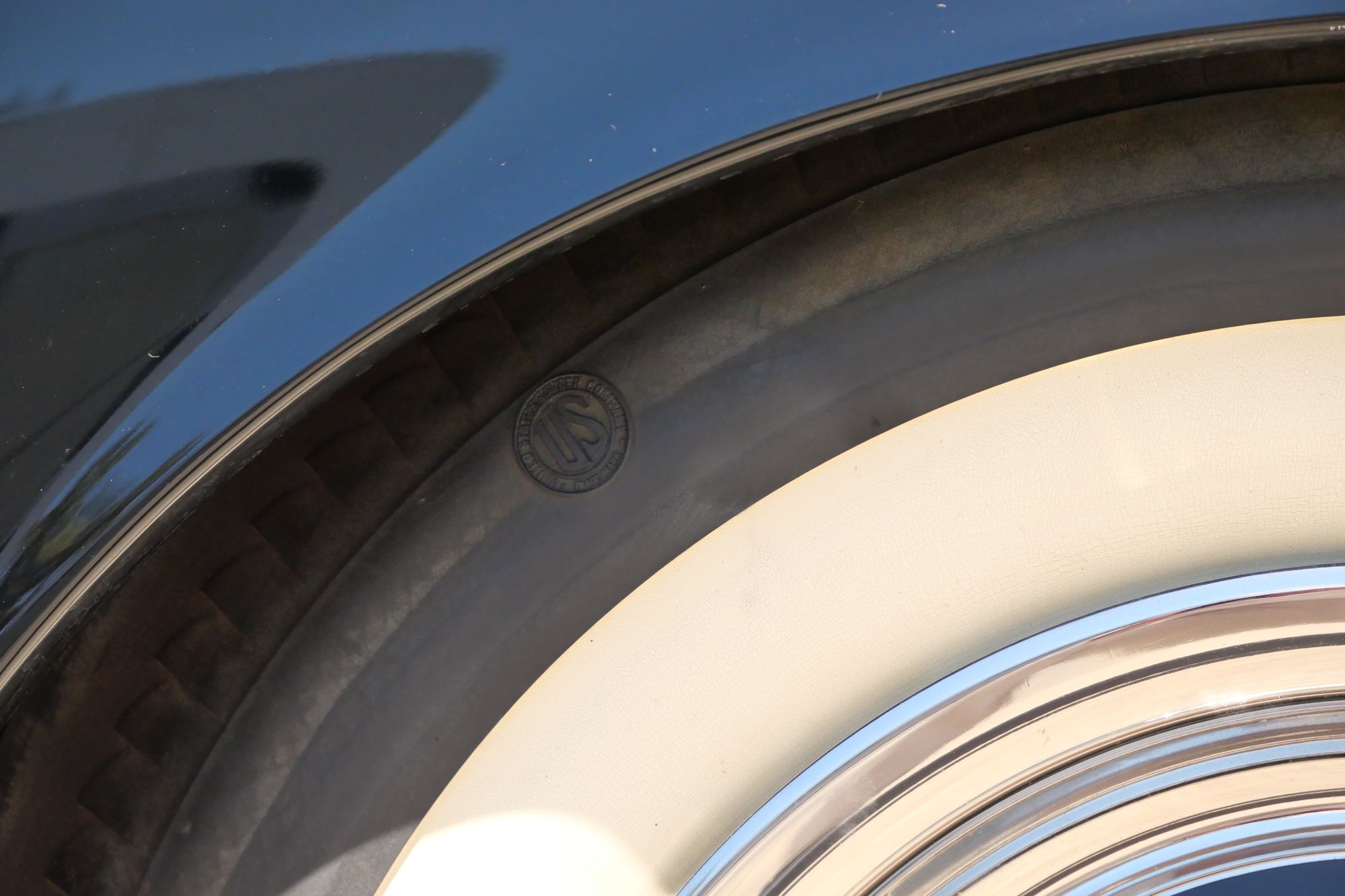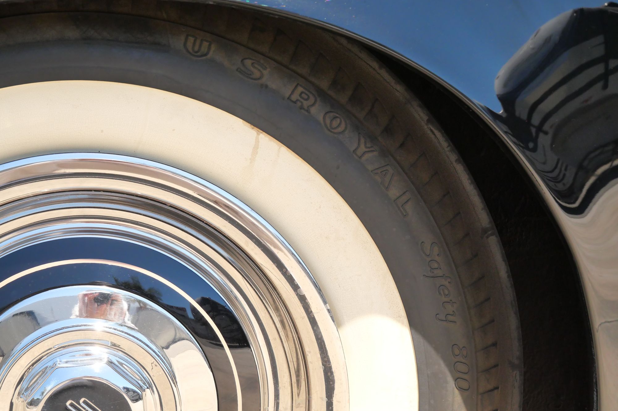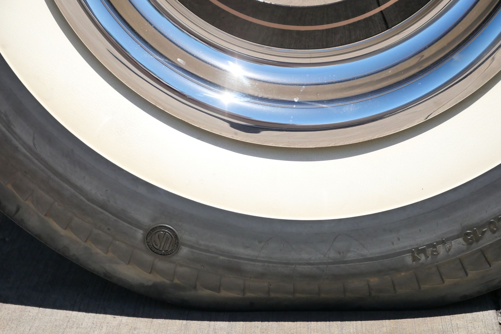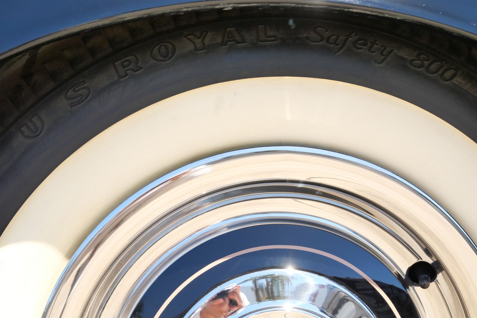 Steel 15” wheels wear bright covers with black and gold accent stripes as well as U.S. Royal Safety 800 whitewall tires. Independent front suspension is handled by unequal-length control arms with coil springs, hydraulic dampers, and an anti-roll bar while a live axle with gaiter-clad half-elliptic leaf springs, a single radius rod, and electrically controlled shock dampers is fitted at the rear. Power-assisted steering and drum brakes came standard.