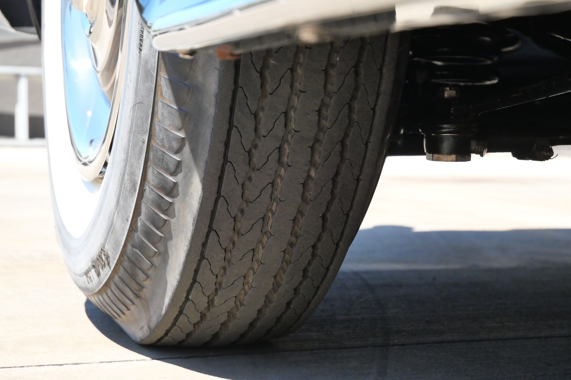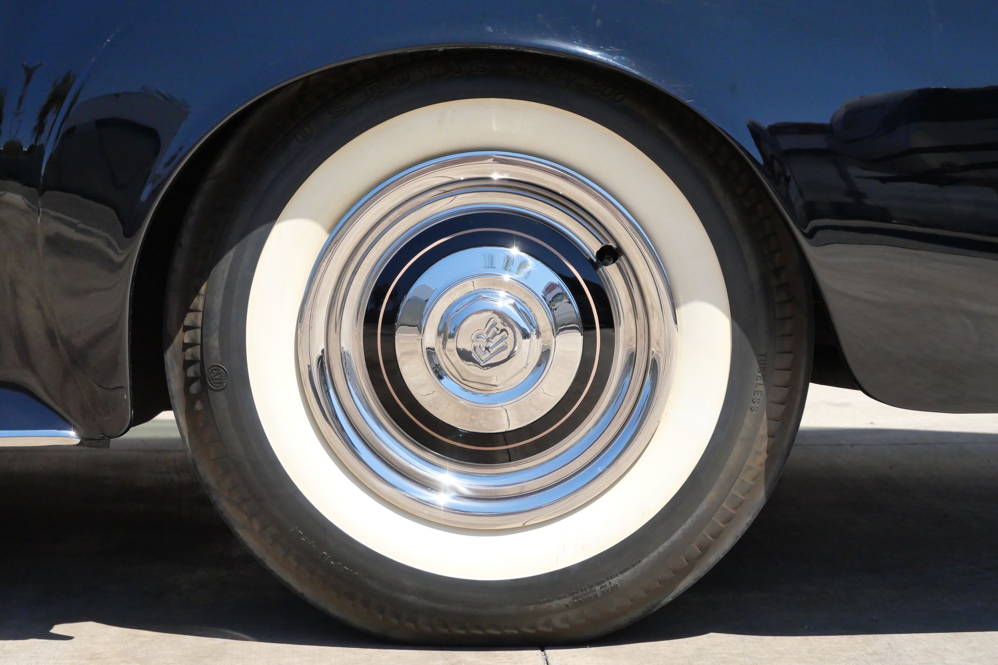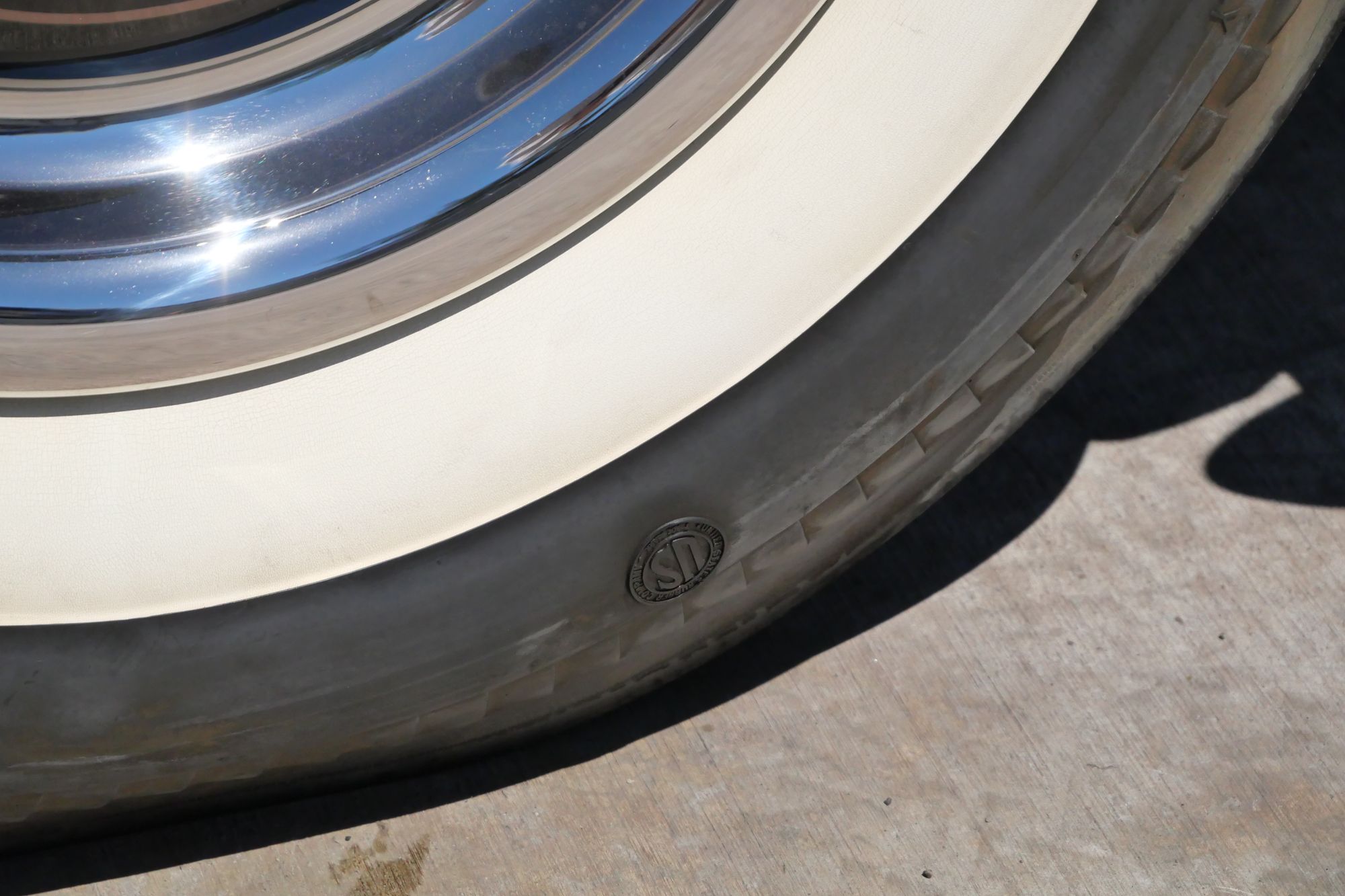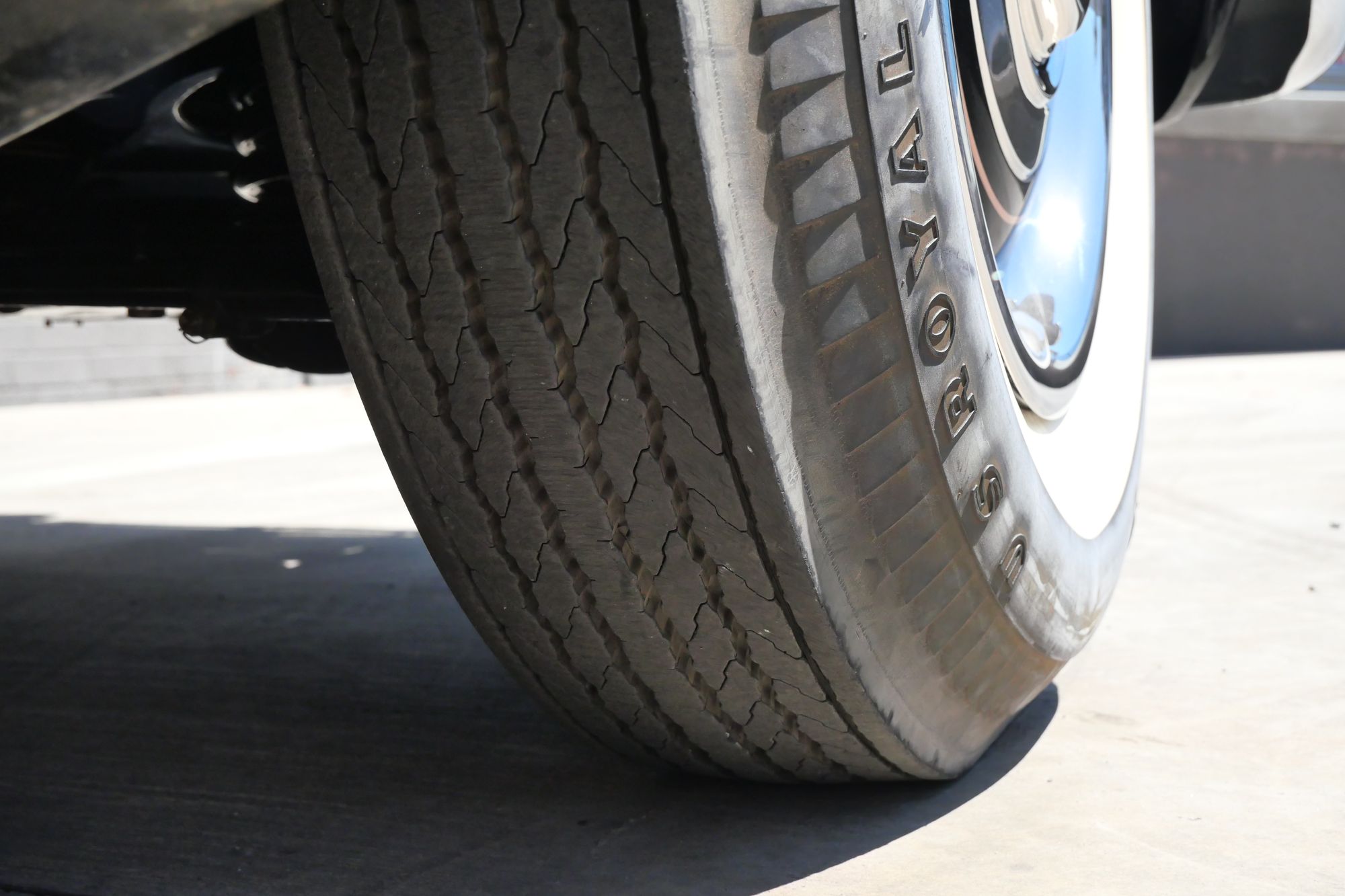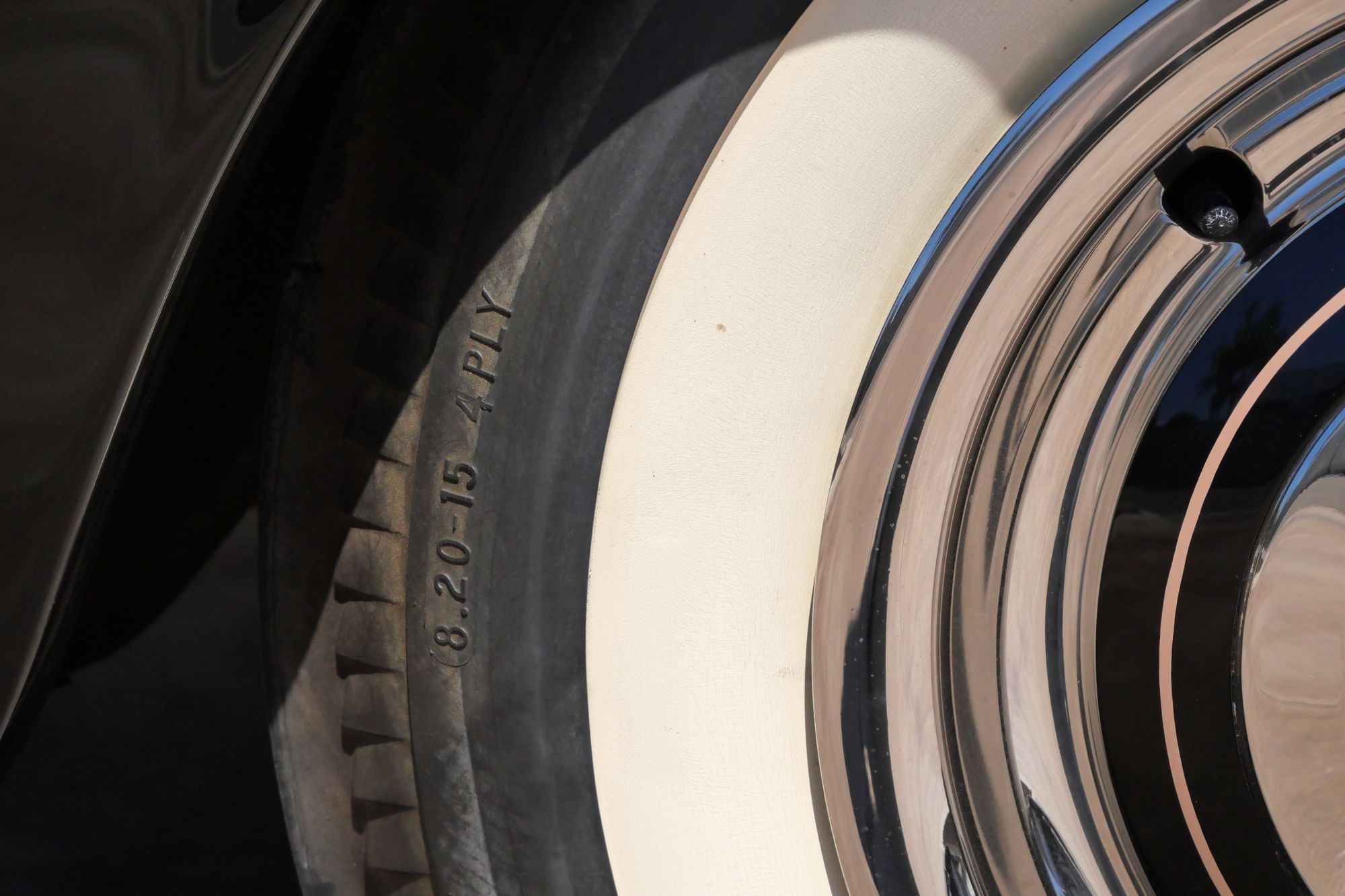 Steel 15” wheels wear bright covers with black and gold accent stripes as well as U.S. Royal Safety 800 whitewall tires. Independent front suspension is handled by unequal-length control arms with coil springs, hydraulic dampers, and an anti-roll bar while a live axle with gaiter-clad half-elliptic leaf springs, a single radius rod, and electrically controlled shock dampers is fitted at the rear. Power-assisted steering and drum brakes came standard.