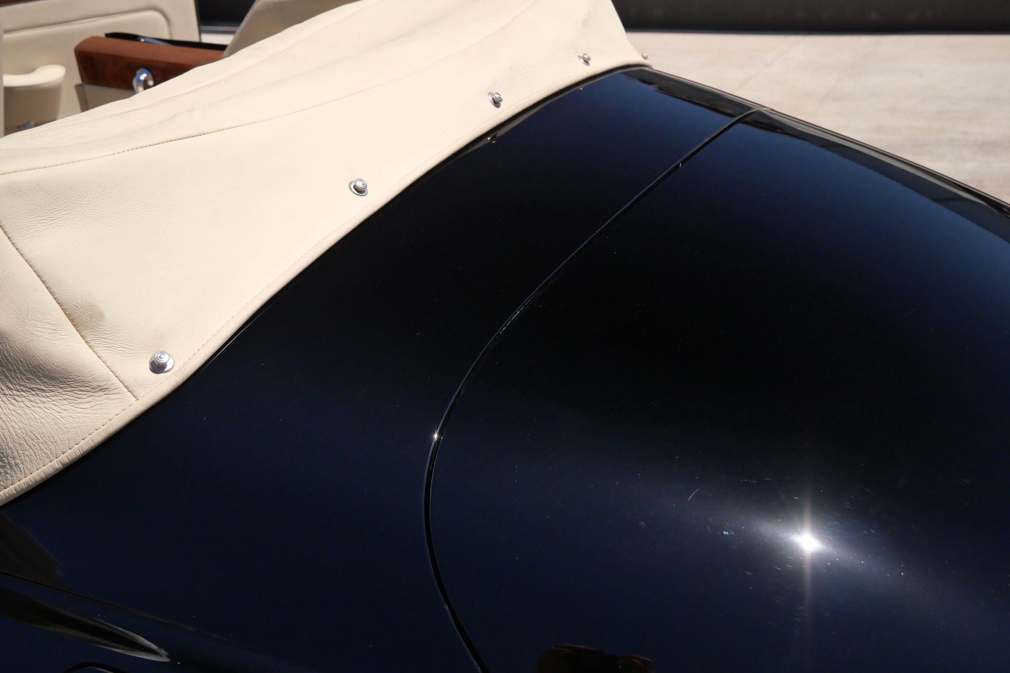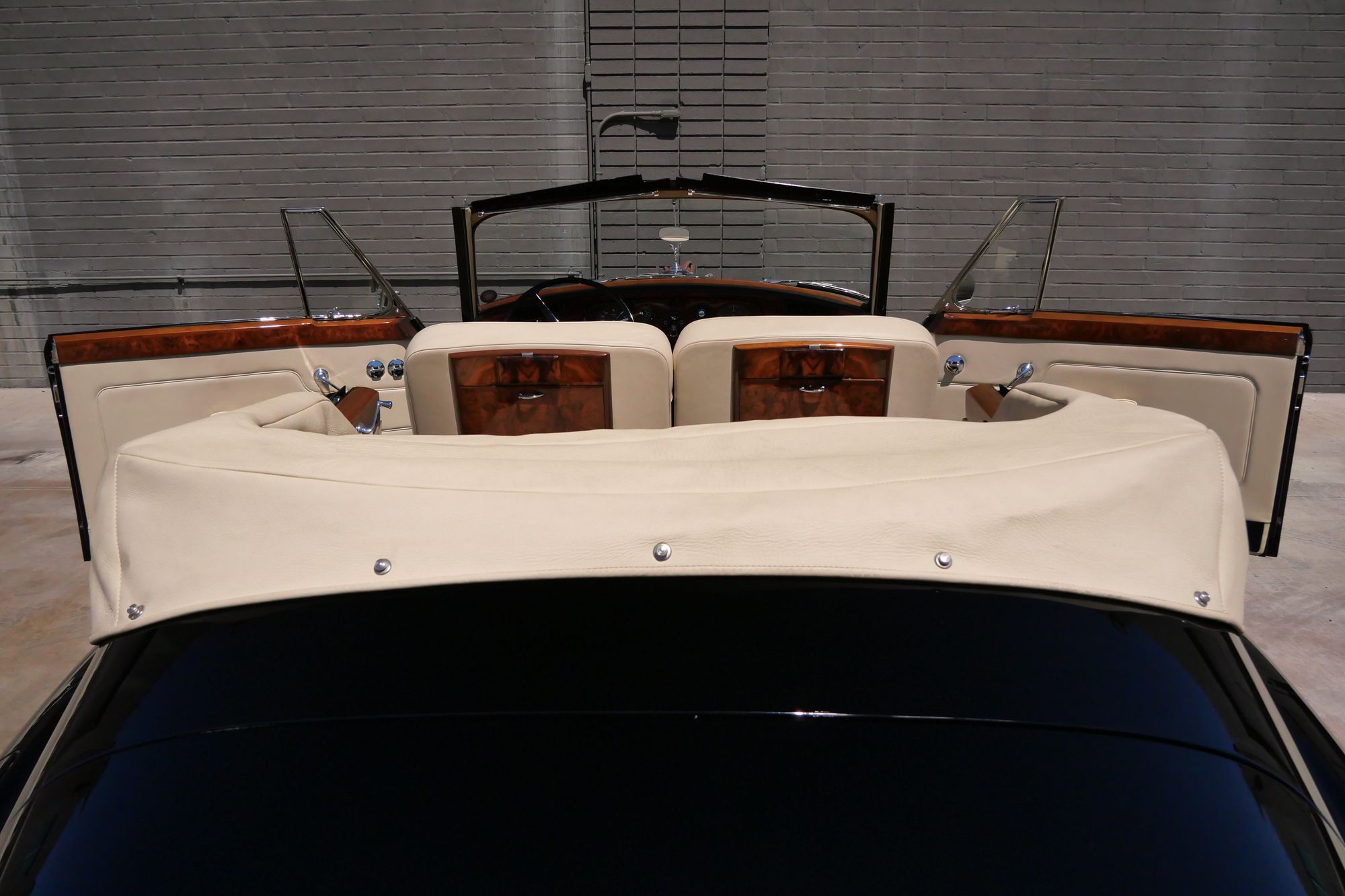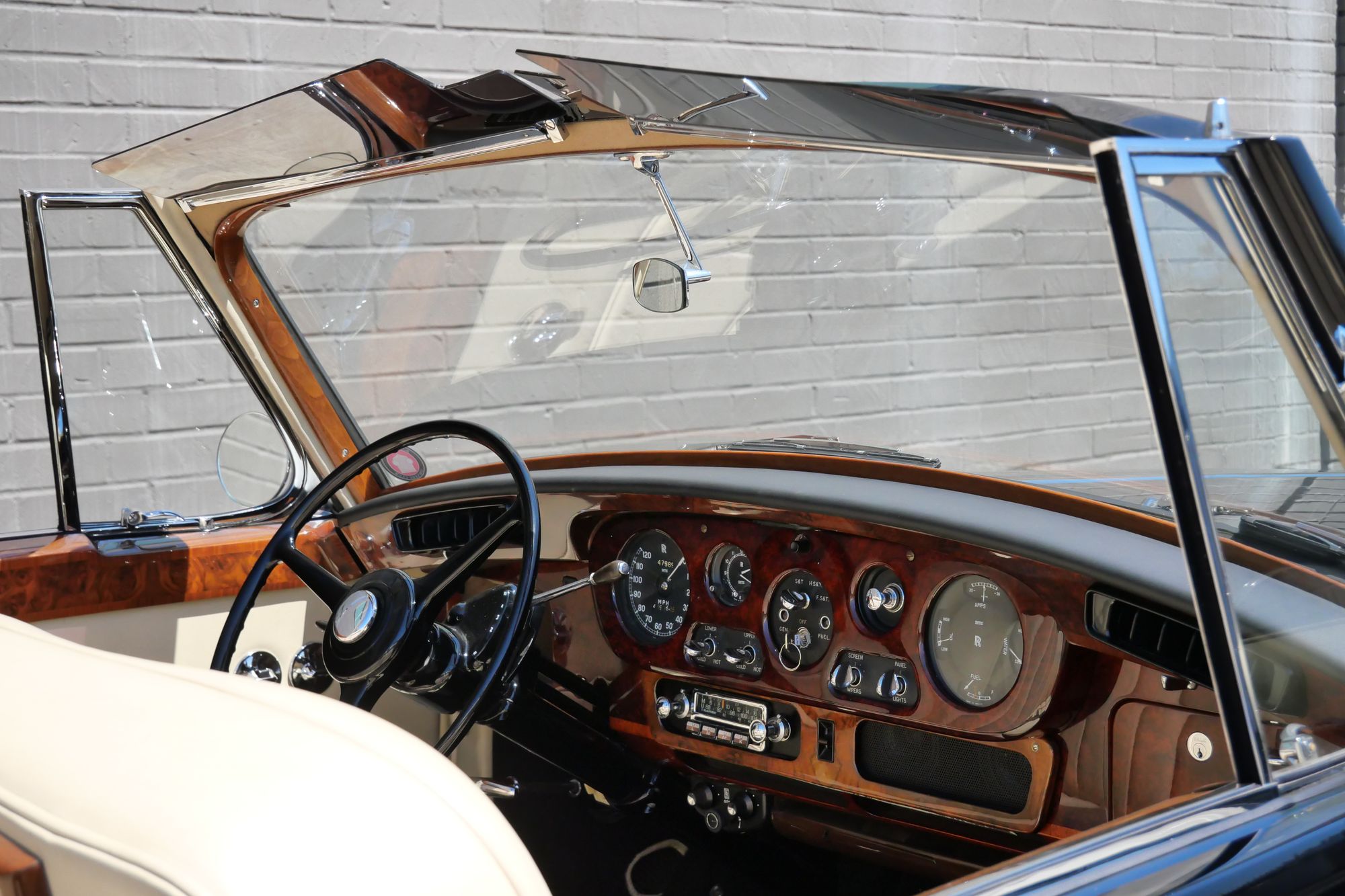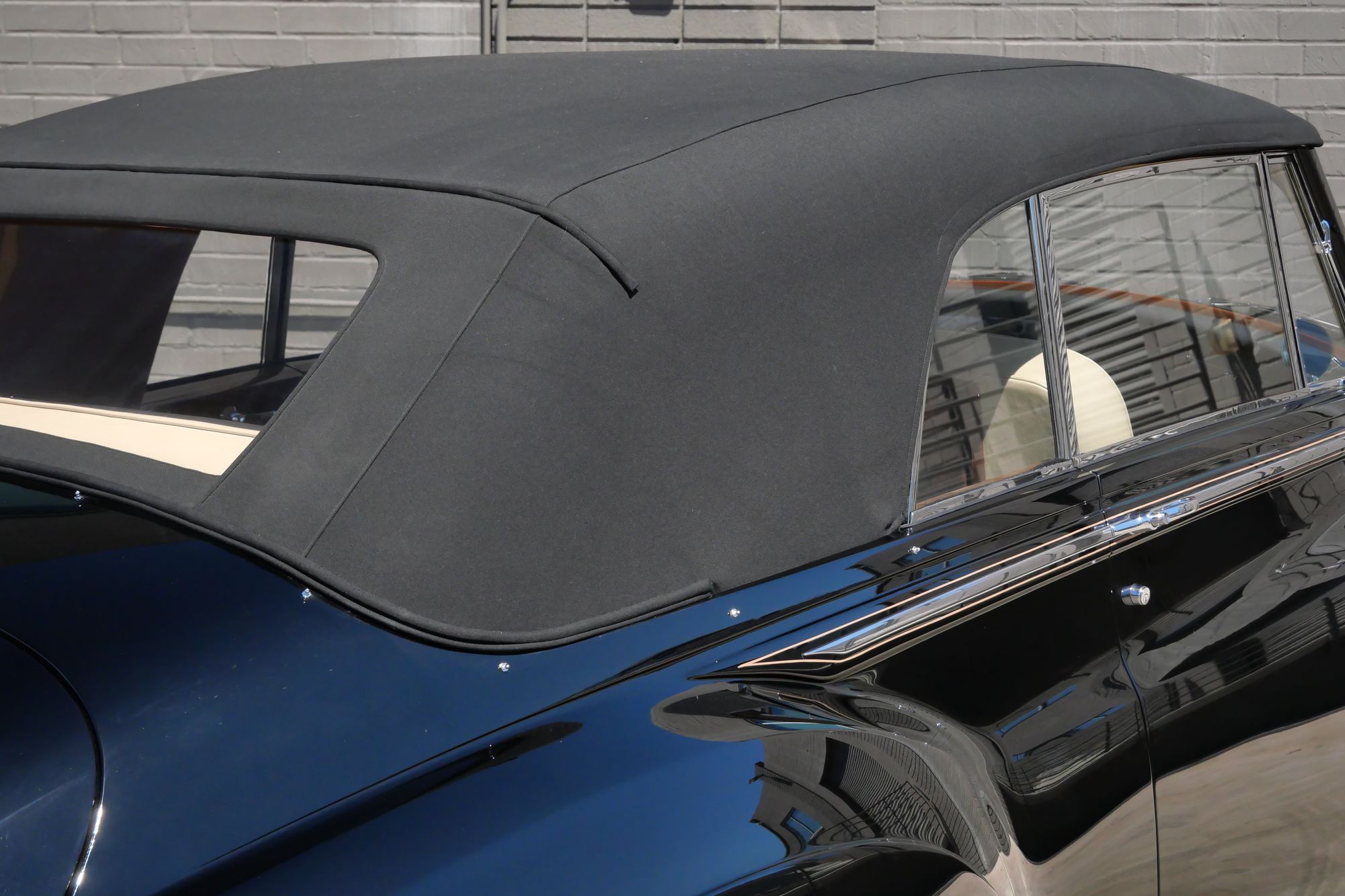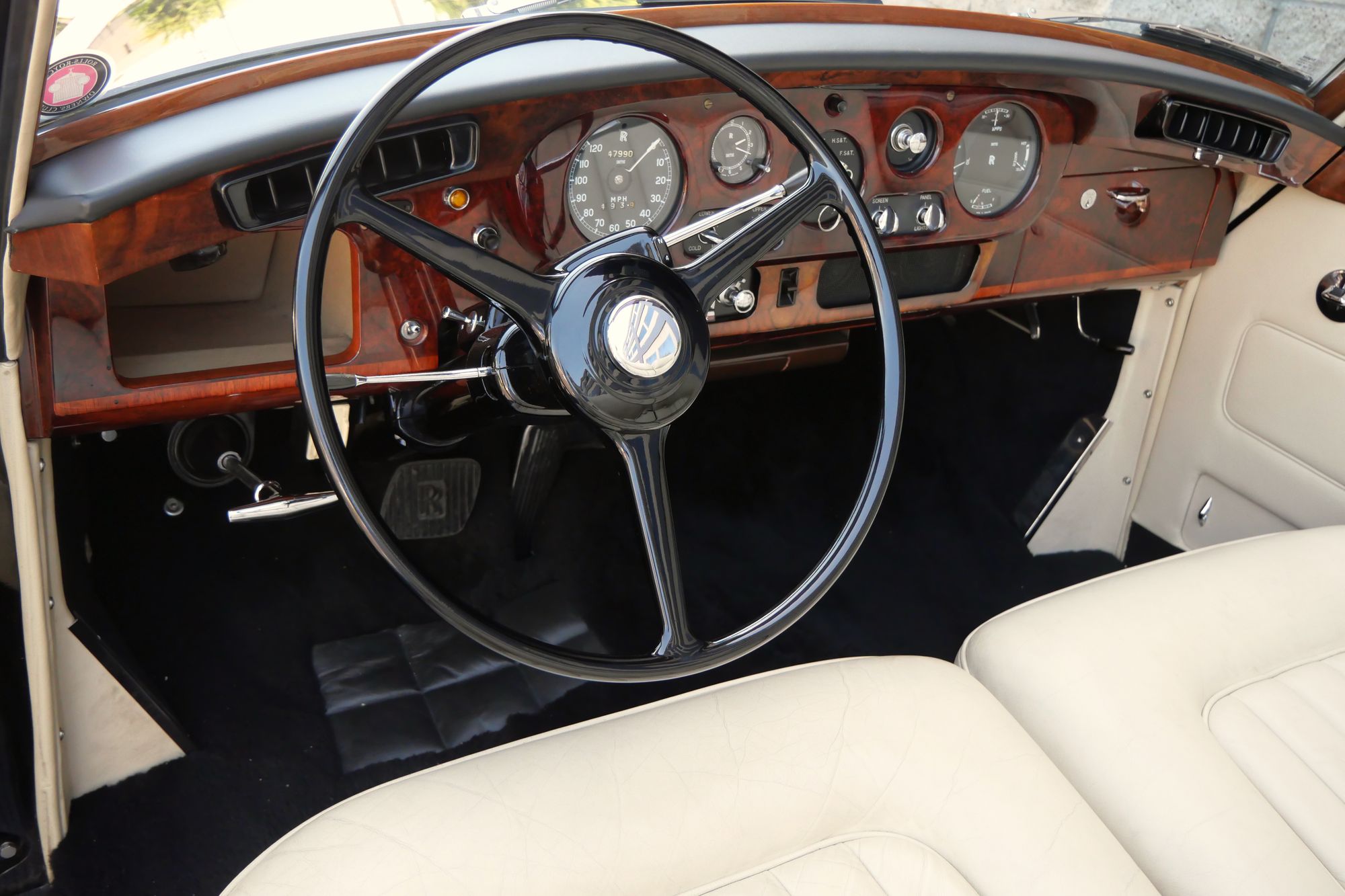 This example is finished in black with a power-operated black convertible top and was repainted during the aforementioned refurbishment. Features include a cream boot cover, Lucas driving lamps, a polished stainless-steel grille, a Spirit of Ecstasy ornament, bright rocker-panel moldings, and chrome bumpers with overriders. Paint meter readings are viewable in the gallery.