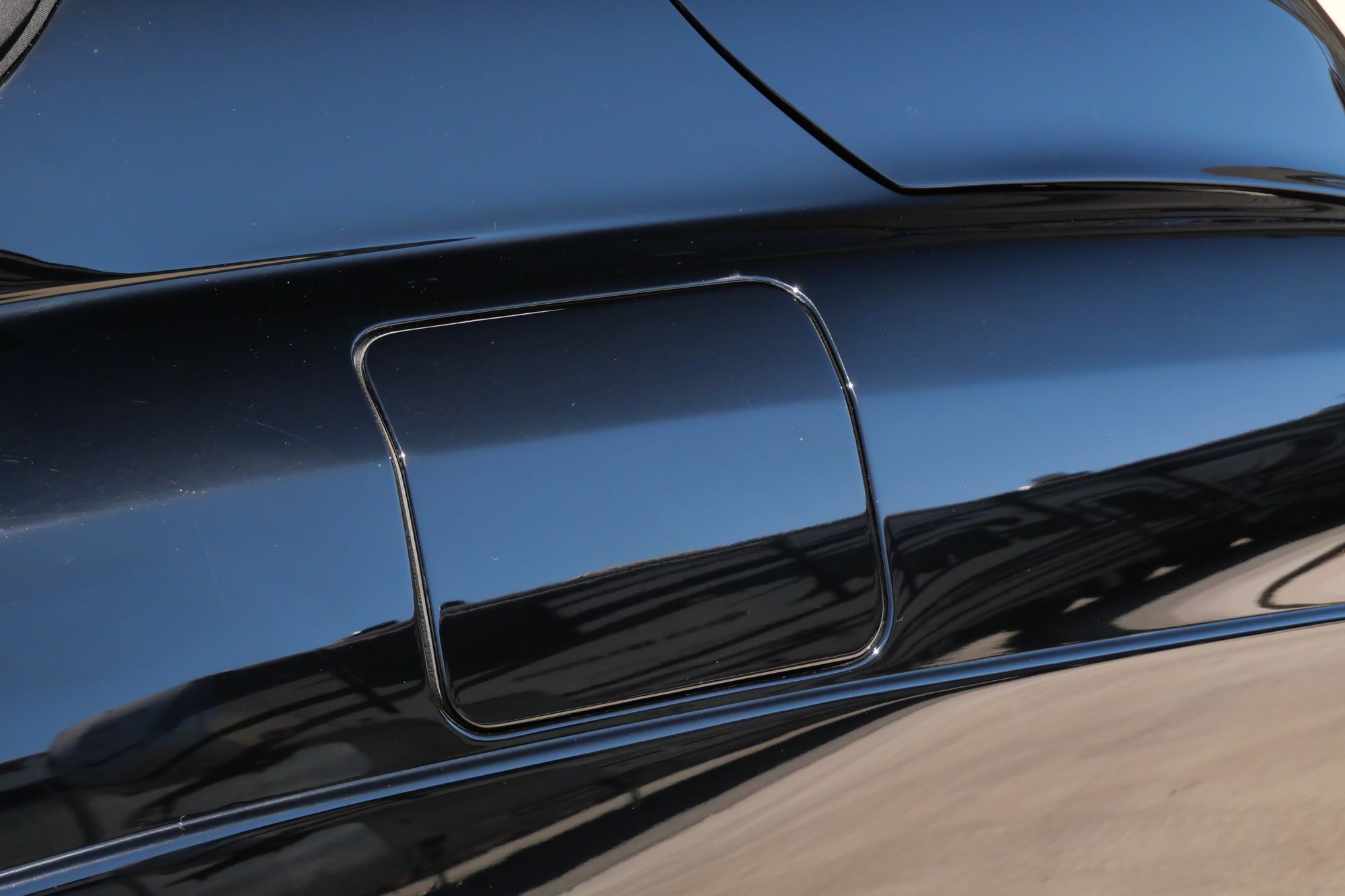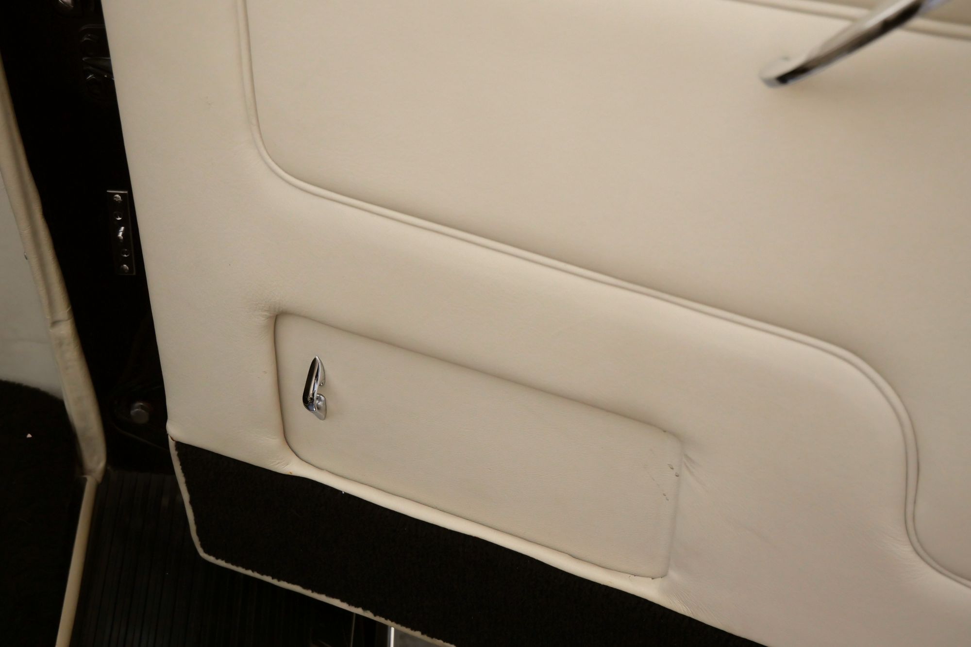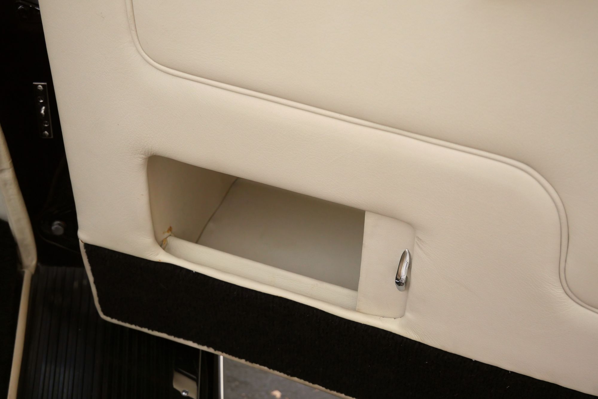 The car was converted to left-hand-drive configuration during the refurbishment, and the split front and rear bench seats are trimmed in cream leather with fold-down center armrests. Contrasting black carpeting overlays the floorboards, and burl wood lines the dashboard and door caps. Amenities include air conditioning, power front windows, roll-down rear windows, and a push-button Blaupunkt Köln AM/FM stereo radio as well as a driver-side cubby, a passenger-side glovebox, and map pockets with sliding covers.
